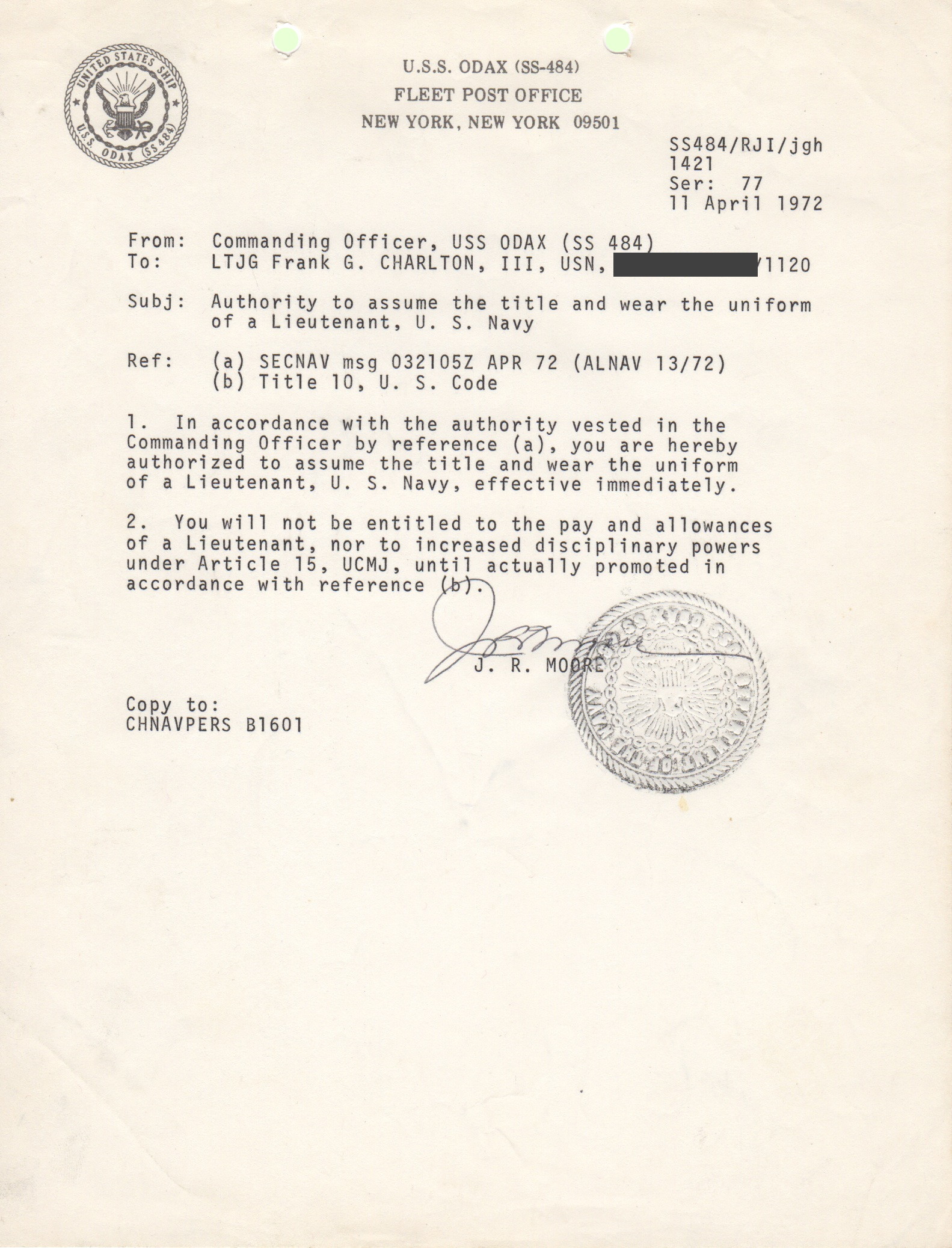 Shortly after I was frocked, we went out for one of these practice days. The skipper took the first shot. Then for the second run he afforded me the standard honor of manning the periscope myself for one of my own torpedos. It was scored as a hit. But best of all was that we found it and my torpedomen recovered it at end of run.